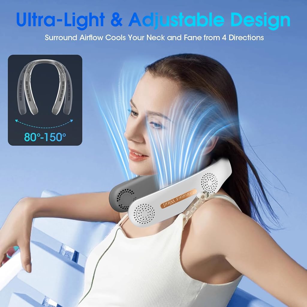 SAFETY & 22 AIR OUTLETS: A novel neck fan that can send the wind without clogging your hands by simply placing it on your neck. Designed without wings, it can be used safely by children and the elderly. When using the fan, you don't have to worry about your hair getting caught on the fan blades. With 22 air outlets around the neck, it can be used for the entire face around, which products enough air to keep you cool always. It is also ideal as a companion for working in hot weather.